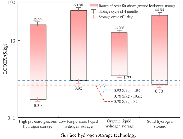 圖4 地面儲氫技術(shù)與地質(zhì)儲氫經(jīng)濟(jì)性對比,其中,High pressure gaseous hydrogen storage 為高壓氣態(tài)儲氫技術(shù);Low temperature liquid hydrogen storage 為低溫液態(tài)儲氫技術(shù);Organic liquid hydrogen storage 為有機(jī)液態(tài)儲氫技術(shù);Solid hydrogen storage 為固態(tài)儲氫技術(shù)